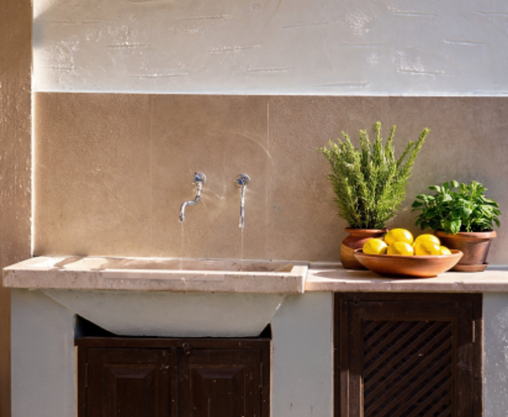 The kitchen is positioned to serve two different moods of the day. In the early hours, it opens towards the cooler back courtyard — ideal for breakfast and calm mornings. Later, it seamlessly serves the front terrace, with views over the pool and the sea. It also connects directly to the outdoor BBQ, making meals outdoors effortless.