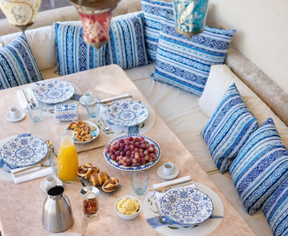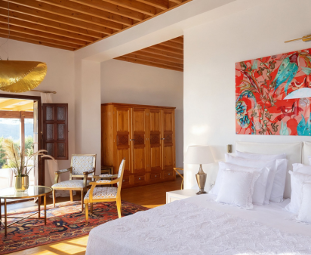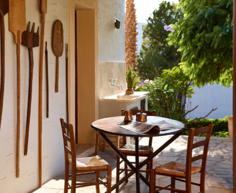 An open passage leads into the living room, defined by the traditional Lindian wooden ceiling. This is where you unwind — read, recharge, and spend unhurried time together. There is also a dedicated desk area with fast internet for anyone who needs to work remotely.