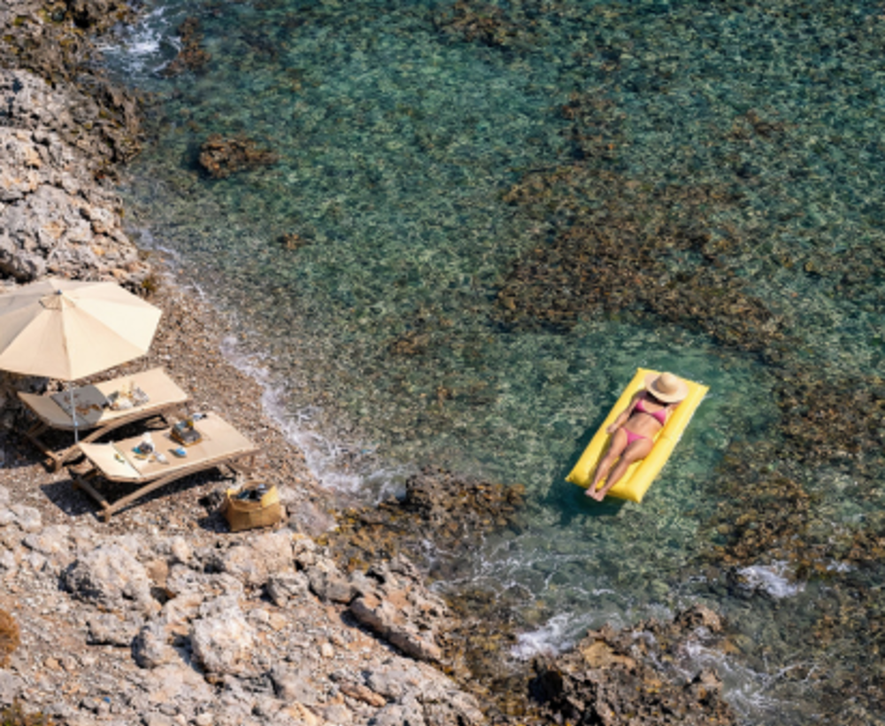 A private path leads from the villa down to the sea, only 150 metres away. In a more rugged, natural setting, you’ll find two sun loungers waiting — the perfect spot for a swim away from the crowds.
